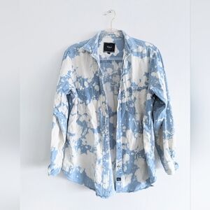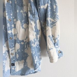 Rails Bleached Button Down Denim Shirt is a pre-owned women's top made of down fabric. The shirt is in size M and has a blue color. It is a basic style button-up shirt with a regular size type.