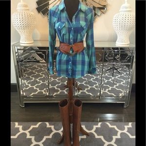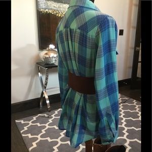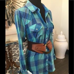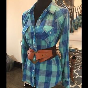 Gorgeous Rails Blouse. Beautiful turquoise and light purple plaid fabric. Drapes and flows effortlessly. New without tags. Pair with your favorite pair of skinny jeans for instant glamour!