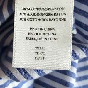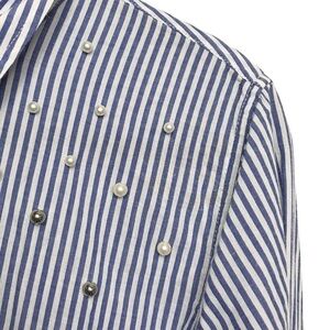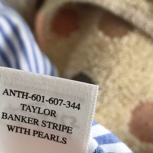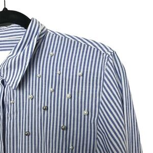 Blue and white, striped, button front, long sleeve shirt with faux pearl embellishments. Preowned with a yellow discoloration and wear on upper front area. See last 2 photos. A bit tricky to photograph.