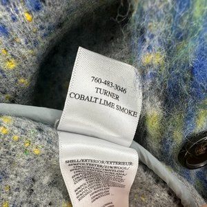 Turner is a heavyweight, cotton wool blend, long sleeve, ivory collared button-down shirt jacket featuring cobalt blue and lime green plaid design, flap pockets at chest.