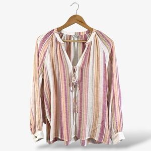 Rails Brielle Linen Top Size S Hibiscus Stripe Pink White Tie Front Long Sleeve