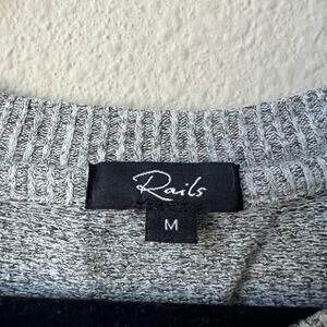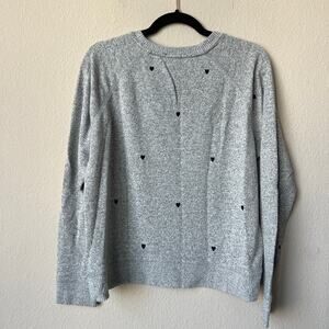 Rails' 'Callahan' sweatshirt in melange grey black hearts. Cozy luxury with a heathered grey body and sweet embroidered black hearts throughout. Features raglan sleeves, ribbed cuffs, and a relaxed silhouette for easy layering. Size medium - 20" pit to pit; 23" total length.