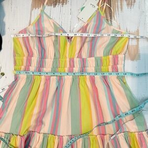 Rails Carmen Mini Dress Guava Rainbow Stripe Smocked Adjustable Fit Flare Size XL. New with tags, no flaws. Measurements are approximates only.