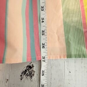 Mini dress features a v-neck, smocking at the bodice, and adjustable straps. Here, vibrant, pastel rainbow colored stripes. True to size. No pockets, unlined.