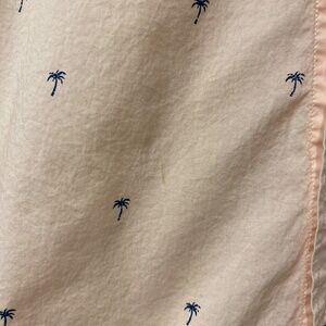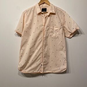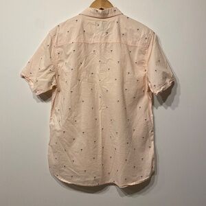 Light pink button down collared t-shirt with palm print. In good condition, there is a small very faint stain, shown in the photos. Size large.