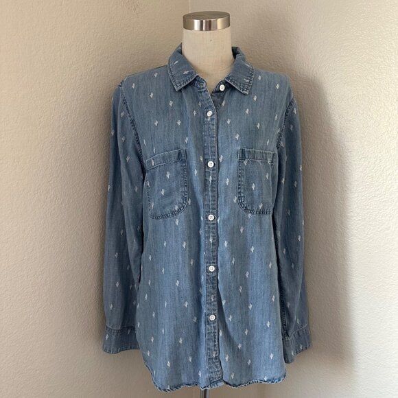 Rails Carter Denim Cactus Graphic Print Button Up Shirttail Hem Long Sleeve Line