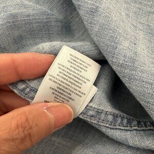 Elevate your casual wardrobe with this stylish Rails Carter denim shirt. Featuring a cactus graphic print, chest patch pockets, and a plaid shirttail hem, this button-up offers a unique blend of comfort and style. Very good used condition.