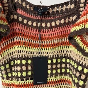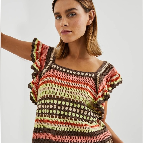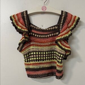 Brighten your look with this colorful crochet crop top. Features playful ruffles and a unique pattern