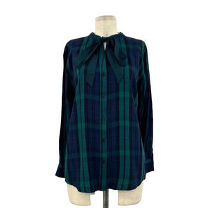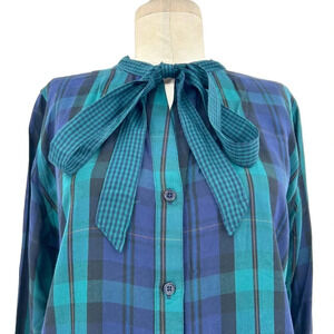 This cute career wear blouse features a navy blue and emerald green plaid patterned blouse with a bow neck tie that has a contrasting micro blue and green gingham pattern. Has long sleeves with buttoned cuffs. With a button front closure and a rounded hemline.