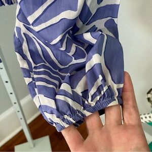 The Rails Katia Top in Island Waves is a cropped, billowy blouse with a plunging v-neckline and adjustable tie details. It features soft shirring details and a midriff hem for a flattering, casual look. The top is made from lightweight beach cotton and has an elegant blue and white pattern