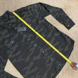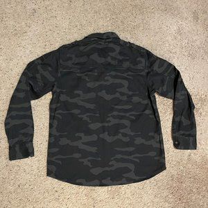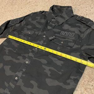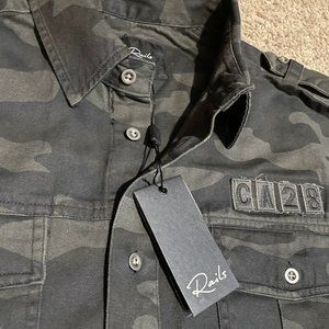 A men's Rails shirt, in black camo with cool military details and patches. Measurements are pictured.