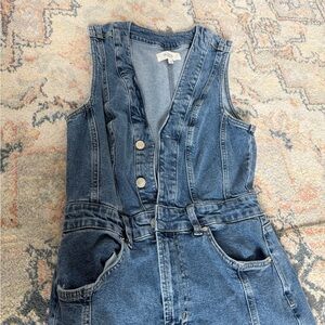 Sleeveless denim dress with button-front closure. Wide-leg silhouette and front pockets. Classic washed blue denim.