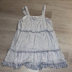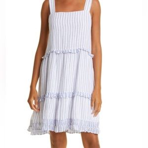 Light and lovely, this linen-blend sleeveless frock features soft stripes and flouncy tiered ruffles.