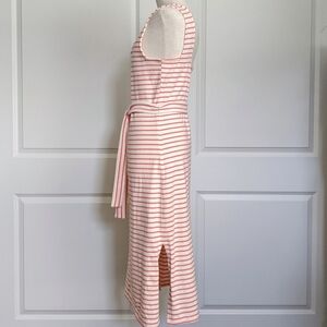 Square neckline. Sleeveless. Heavy knit cotton jersey knit. Striped. Self tie belt at waist. High side slits. Unlined. Pullover style. Slim, midi silhouette.