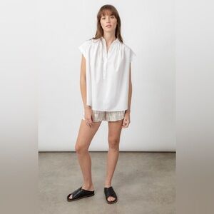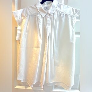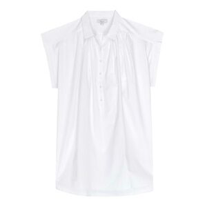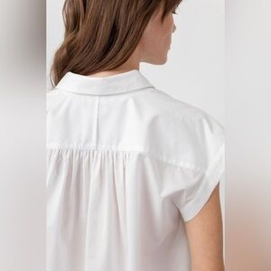 Crisp cotton poplin, short sleeve, bright white v-neck top featuring oversized fit, half placket neckline, soft shirring at neck and front yoke, cap sleeves, and extended shirt tail.