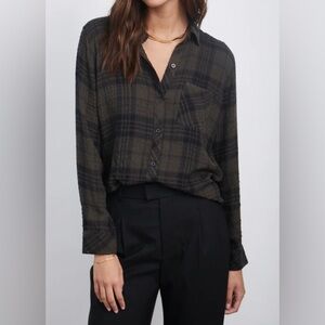 Great pre loved condition size XS , super soft and comfy, buttons down, black and green plaid , collar, buttons at cuffs of sleeves, perfect fall top for layering