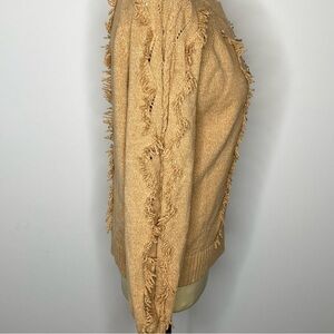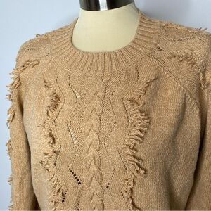 Rails Francis Fringe Sweater in Camel. Super soft cotton blend crew neck sweater with textured cable knit. Fringe trim details on sleeves and center front and back. So soft and cozy. Stock photos included to show fit. New without tags, just didn't like the color on me.