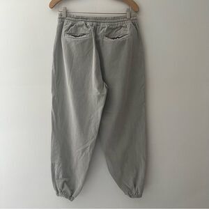 The Haven Pant is an easy jogger in sage green with a washed, vintage look, oversized side pockets, and front seams. Up top is a drawstring elastic waist, and below, the pant ends in a tapered cuff. A cotton twill fabrication means it's so incredibly soft.