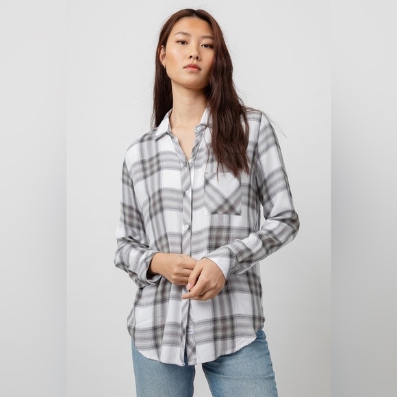 The classic RAILS long sleeve plaid buttondown shirt. Made from our signature, ultra soft rayon fabric featuring a loose twill weave. This style is a year-round comfort classic with ash grey and light mint green plaid on a soft white base.