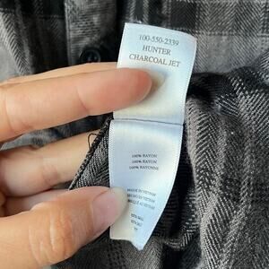Rails 'Hunter' button down plaid shirt in charcoal jet. Classic long sleeve plaid button-down made from signature, ultra soft rayon fabric featuring a loose twill weave. Single layer with one chest pocket. Size XS - 18.5" pit to pit; 25" total length.