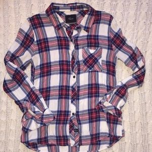 The softest Plaid shirt! I am so sad to sell but after having my baby it doesn't fit. In great condition, work only a handful of times. 100% rayon. Size small. Colors are white, blue, and red with a little splash of black.