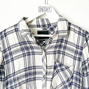 Rails Hunter Plaid Shirt in White & Navy. Features True to size. Slim fit. If you prefer a looser fit, we recommend sizing up, Point collar, long sleeves, button cuffs, Front button closures, chest patch pocket, Rounded high/low hem, back yoke with inverted pleat, & Allover plaid pattern. In excellent condition. No holes, rips, or stains. Ours is a pet & smoke free home.