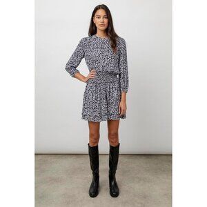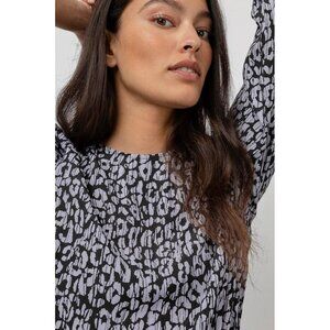 Lightweight, rayon crepe, long sleeve, lined, onyx black mini dress featuring light lilac cheetah print throughout, crew neckline, back keyhole with loop button closure, smocked waistline, and double layer tiered skirt. A pullover style dress with elastic waistline and flowy skirt make for easy wearability with a feminine touch.