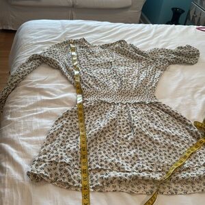 Very nice dress 100% rayon. It’s like a off white with gray flowers