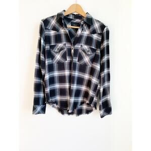 This super soft plaid flannel features full-length sleeves, a stylish raw hem, and convenient snap button closures.