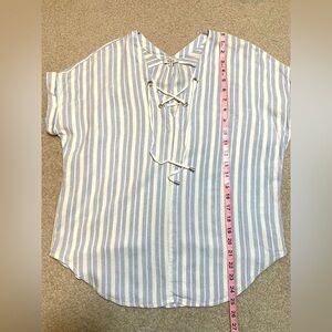 Rails Jeri Holland Top Women Baby Blue White Stripe Lace Up Short Sleeve Small. Rayon Linen Blend.