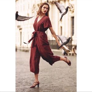 Rails short sleeve wide leg jumpsuit features abstract dot print. Partial front button placket. Elasticized belted waist. Side slant pockets.