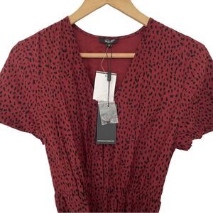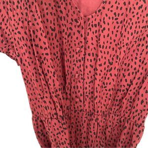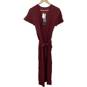 Rails short sleeve wide leg jumpsuit features abstract dot print. Partial front button placket. Elasticized belted waist. Side slant pockets.