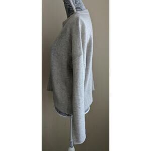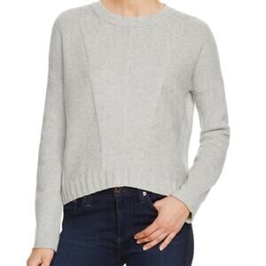 Ultra soft cropped pullover knit sweater in heather gray. Ribbed neck and hem. Crew neckline. Long sleeves; raw-edge. Relaxed fit. Pullover style. Arched hem.