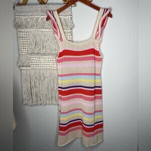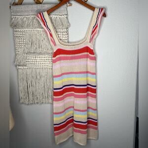Rails June Ruffle-Sleeve Knit Mini Dress size small. COLOR is Tan Multi Stripe. 70s-inspired knit dress framed with playful ruffle cap sleeves.