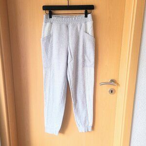 Ultra cozy, lounge terry, high rise, heather grey sweatpants with elastic waist featuring oversized patch pockets, tapered leg, side panels, cuff leg and ribbed at hem.