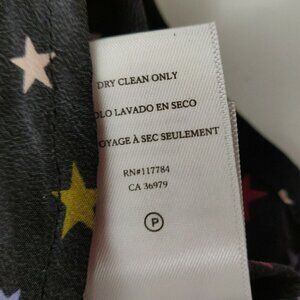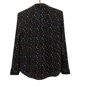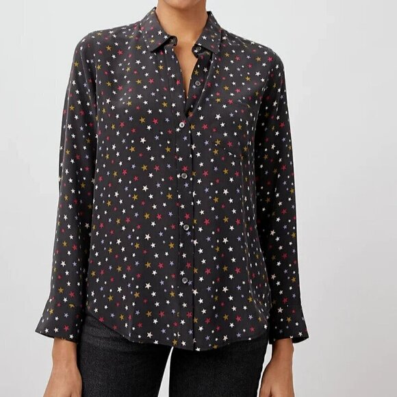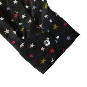 Rails Kate silk Rainbow Stars button front shirt in women's size XS. Multicolored stars on black. Long sleeves. Chest pocket. Soft washed silk.