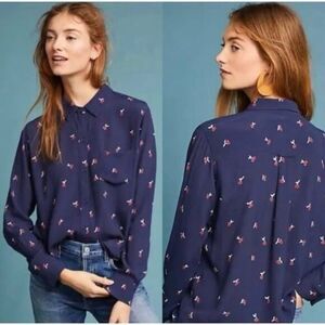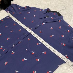 SO cute and in good preowned condition from Rails! A stylish navy blue top features a delicate cherry pattern. Front button closure. Spread collar. Long sleeves with button cuffs. Chest patch pocket. Back yoke. Curved hem.