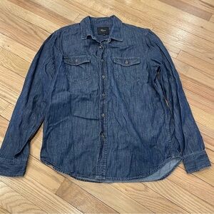 The same easy comfort of a jersey t shirt in an elevated buttondown style this lightweight cotton, long sleeve, denim collared buttondown shirt features a double chest flap utility pockets and slim slightly relaxed fit.