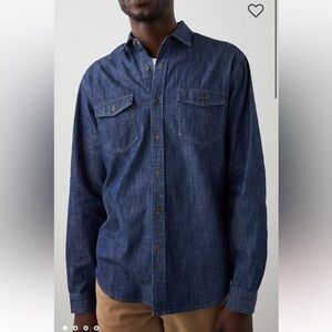 The same easy comfort of a jersey t shirt in an elevated buttondown style this lightweight cotton, long sleeve, denim collared buttondown shirt features a double chest flap utility pockets and slim slightly relaxed fit.
