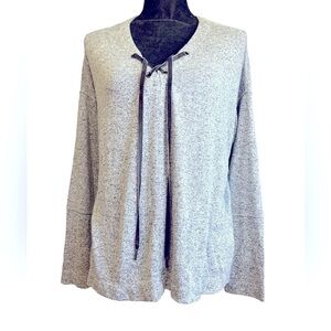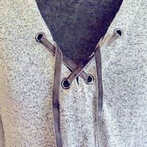 This super soft sweatshirt with a cute velvet laced tie in the front is a great addition to any wardrobe. A little oversized to give a comfy feel.