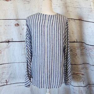 Associated with classic French style and weekends in Nantucket, stripes - like the ones found on this top - are a timeless staple. Linen blend white and blue striped long sleeve top with lace up v neckline. In great condition.