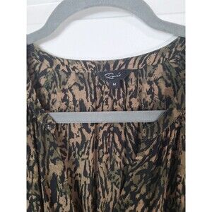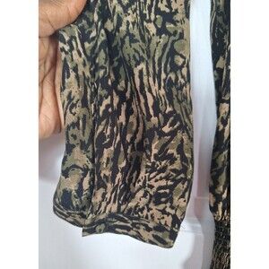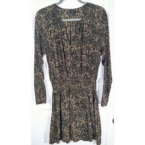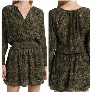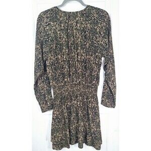 The Rails Long Sleeve Jasmine Dress in Olive Static, size Medium, is a stylish and versatile piece perfect for various occasions such as travel, parties, casual outings, and even workwear. This V-neck dress features a trendy animal print pattern with a pullover closure and ruffle accents, adding a touch of bohemian flair. Made from a blend of rayon and viscose, the dress is lightweight and comfortable, making it suitable for all seasons. With its mini length and long sleeves, this dress is a must-have for any fashion-forward woman looking to make a statement.