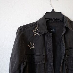 The Rails Loren shirt in black metallic stars is a slightly washed black, collared button down shirt jacket featuring metallic gold star embroidery. The shirt is the perfect addition to any wardrobe and will quickly become a wardrobe staple. The military details including patch pockets at chest, metal buttons and raw hem look great when teamed with denim whether it is worn on its own as a shirt or worn open over a t-shirt.