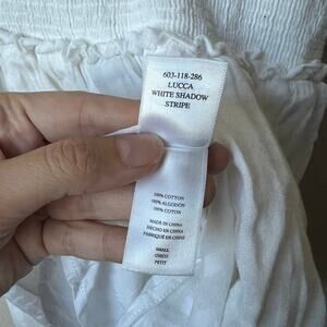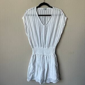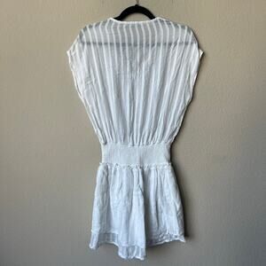 Rails 'Lucca' White Shadow Stripe mini dress. Gauzy semi sheer fabric. Plain weave. Subtle, textured stripes. Smocked elastic drop waist. V-neckline, sleeveless silhouette. Size small - 11" drop smocked waist (has lots of stretch), pit stretches up to 20"; 33" total length.