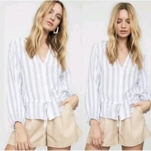 Introducing the Rails Marti Cayman Stripe Lightweight Linen Button Up Tie Waisted Top Blouse S, a stylish and versatile addition to your wardrobe. With a striped pattern and V-neckline, this blouse features long sleeves with button closures and a tie waist for a flattering silhouette. Perfect for casual occasions, this blouse is made of lightweight and breathable linen fabric with knit texture, giving you both comfort and style.