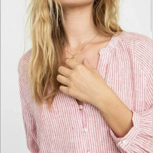 Lightweight linen, wrist-length peasant sleeve, V-neck button-down top with adjustable self-tie drawstring waist. Features delicate shirring detail at neckline and sleeves to create a billowy romantic effect.