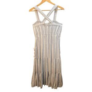 Keywords: Rails dress, striped midi dress, sleeveless dress, casual sundress, women's dress, summer dress, button front dress, tie waist dress, midi dress, pockets, criss cross straps, tiered skirt, bohemian dress, beach dress