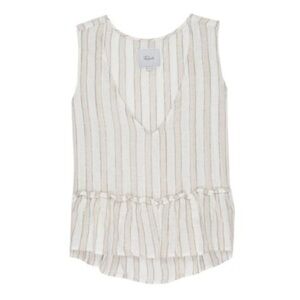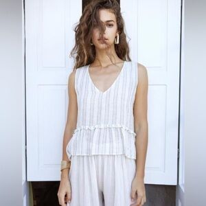Lightweight linen, sleeveless, V-neck striped top featuring high-low soft flounce hem and metallic Lurex threading. Relaxed fit, super easy to just throw on and go.
