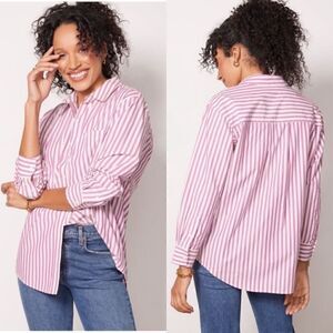 A piece from our Eco Collection, The Arlo Shirt is a crisp button-down shirt made from lightweight cotton poplin. While it's inspired by classic menswear styling, pink stripes add a feminine twist. The oversized fit is comfortable for day-to-night wear and pairs nicely with denim and your favorite boots.