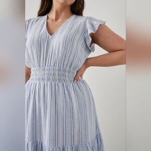 The charm of the Tara Dress lies in its versatility, perfectly appropriate for dinner with heels or all-day in sneakers. With a blue-striped pattern, this mini dress is made of the softest-feeling luxe linen with flutter cap sleeves, a flowy tiered skirt, and a smocked waistline.